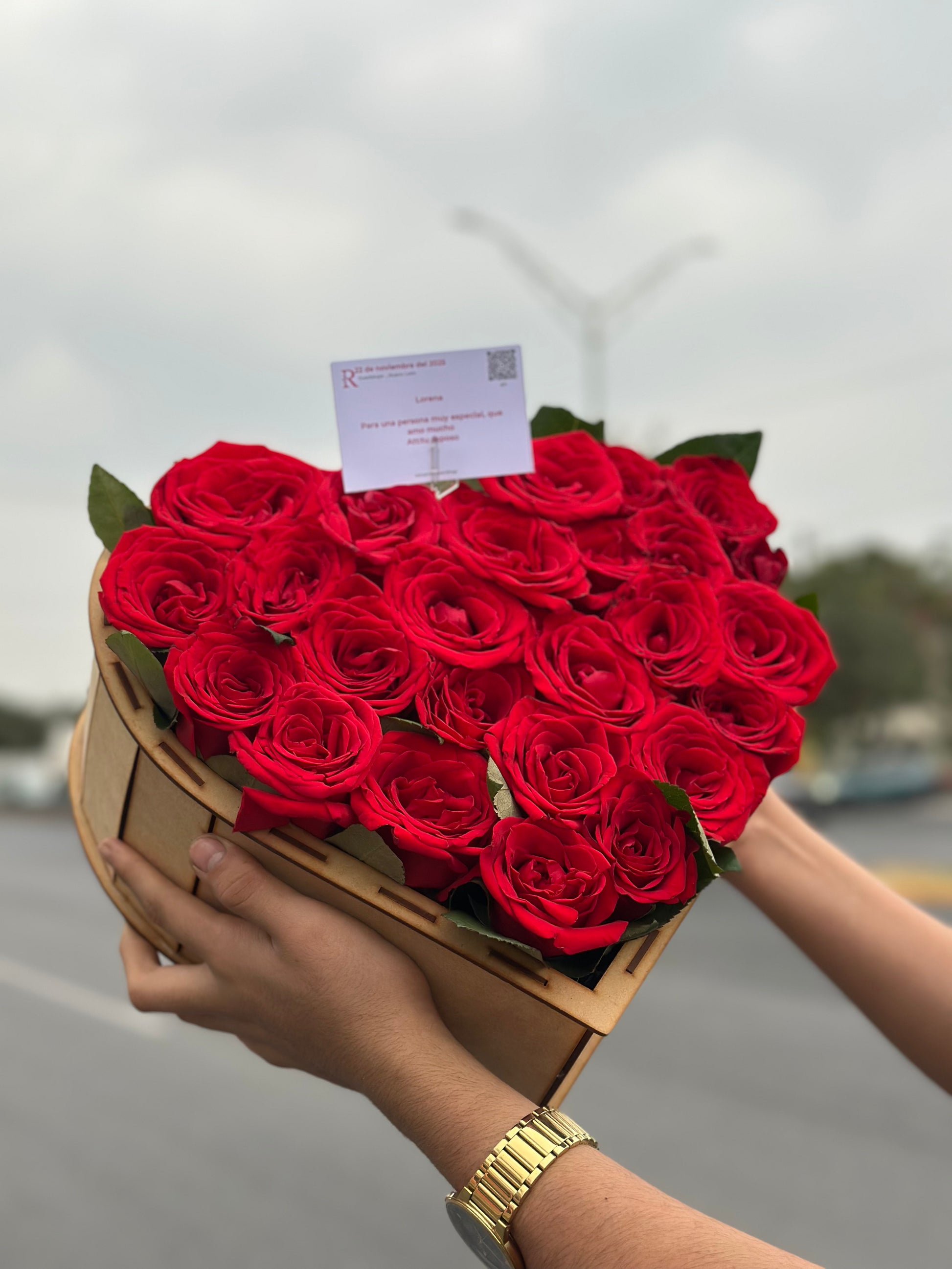 Un detalle que enamora al instante: caja en forma de corazón rellena con 24 rosas rojas frescas, acomodadas con delicadeza para crear un regalo romántico, clásico y perfecto para cualquier ocasión especial.