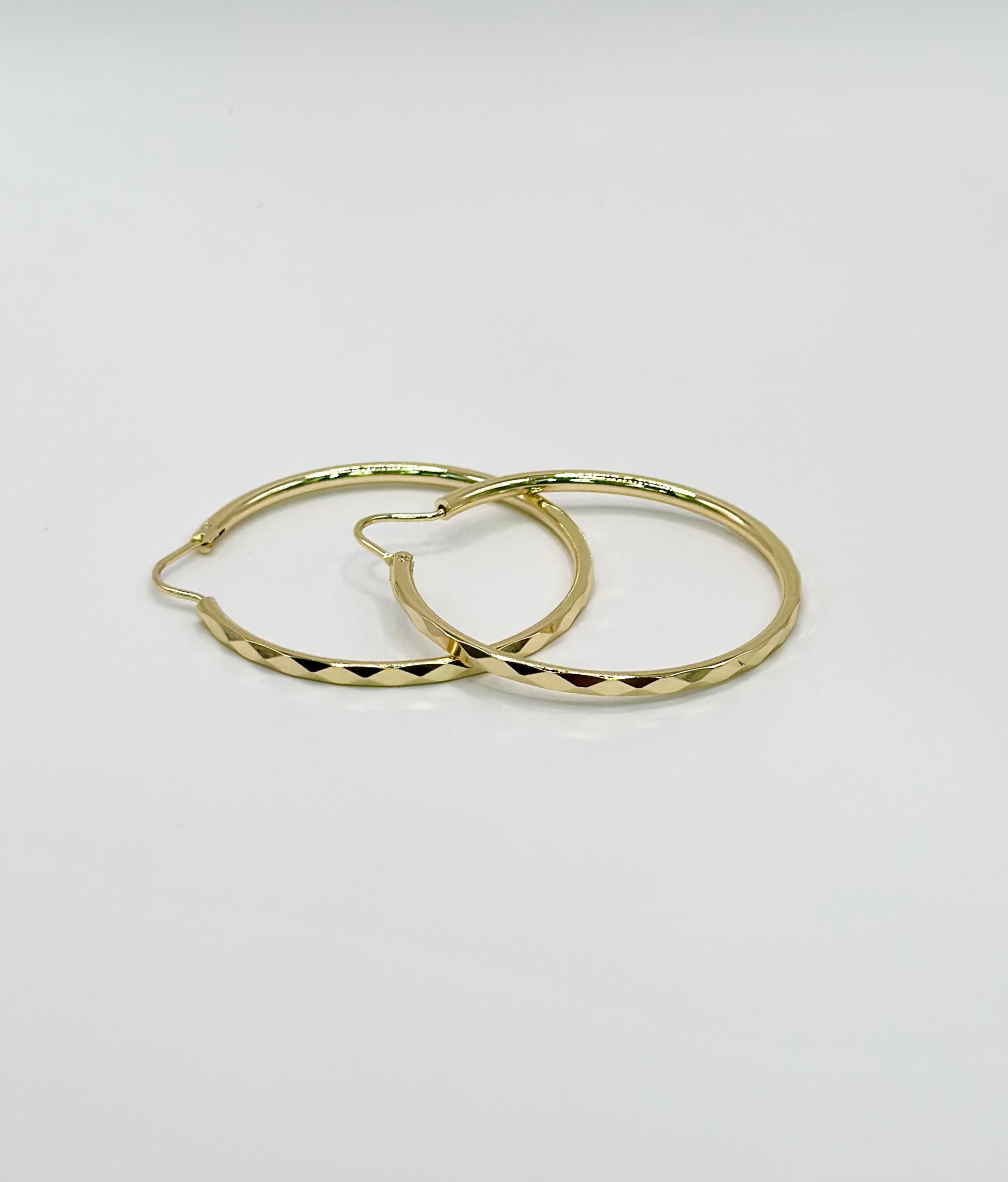 Estos aros grandes en chapa de oro 18k destacan por su acabado facetado que refleja la luz con cada movimiento.