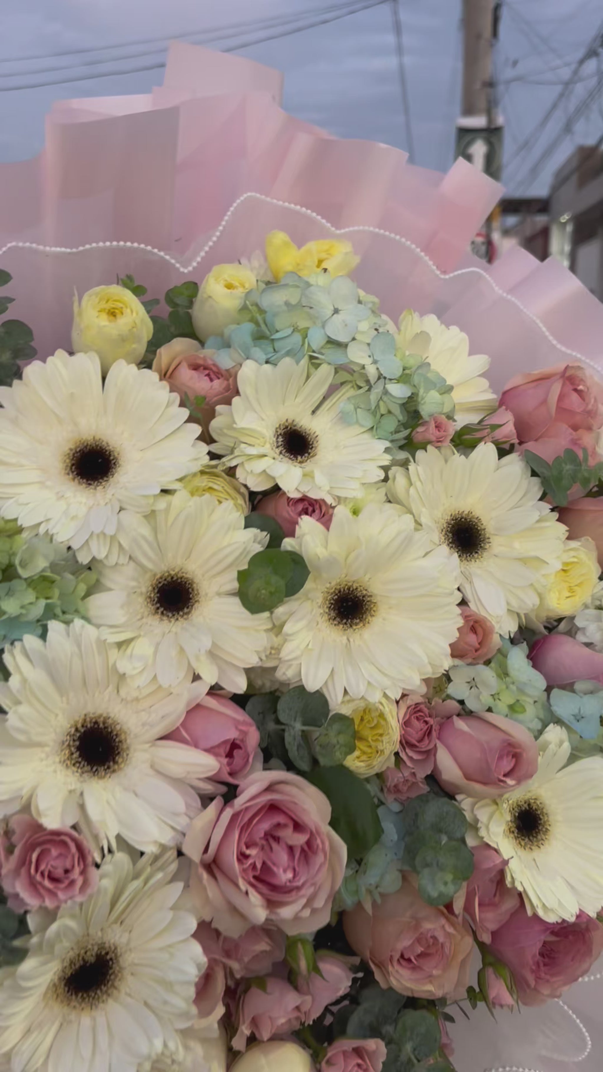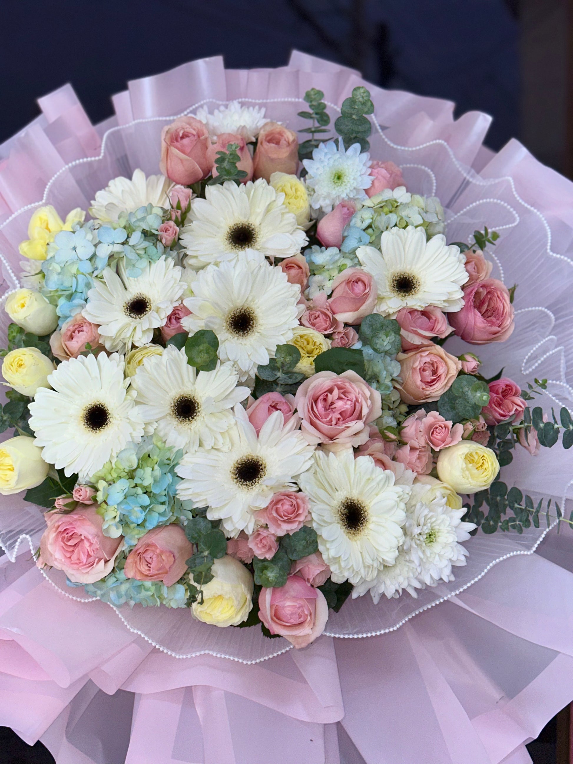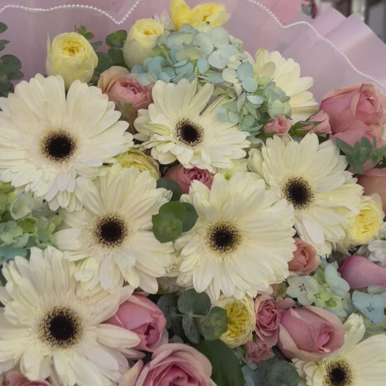 Un diseño exclusivo que combina rosas inglesas, mini rosas, hortensias y follajes finos, envueltos en papel premium con detalles de perlas.