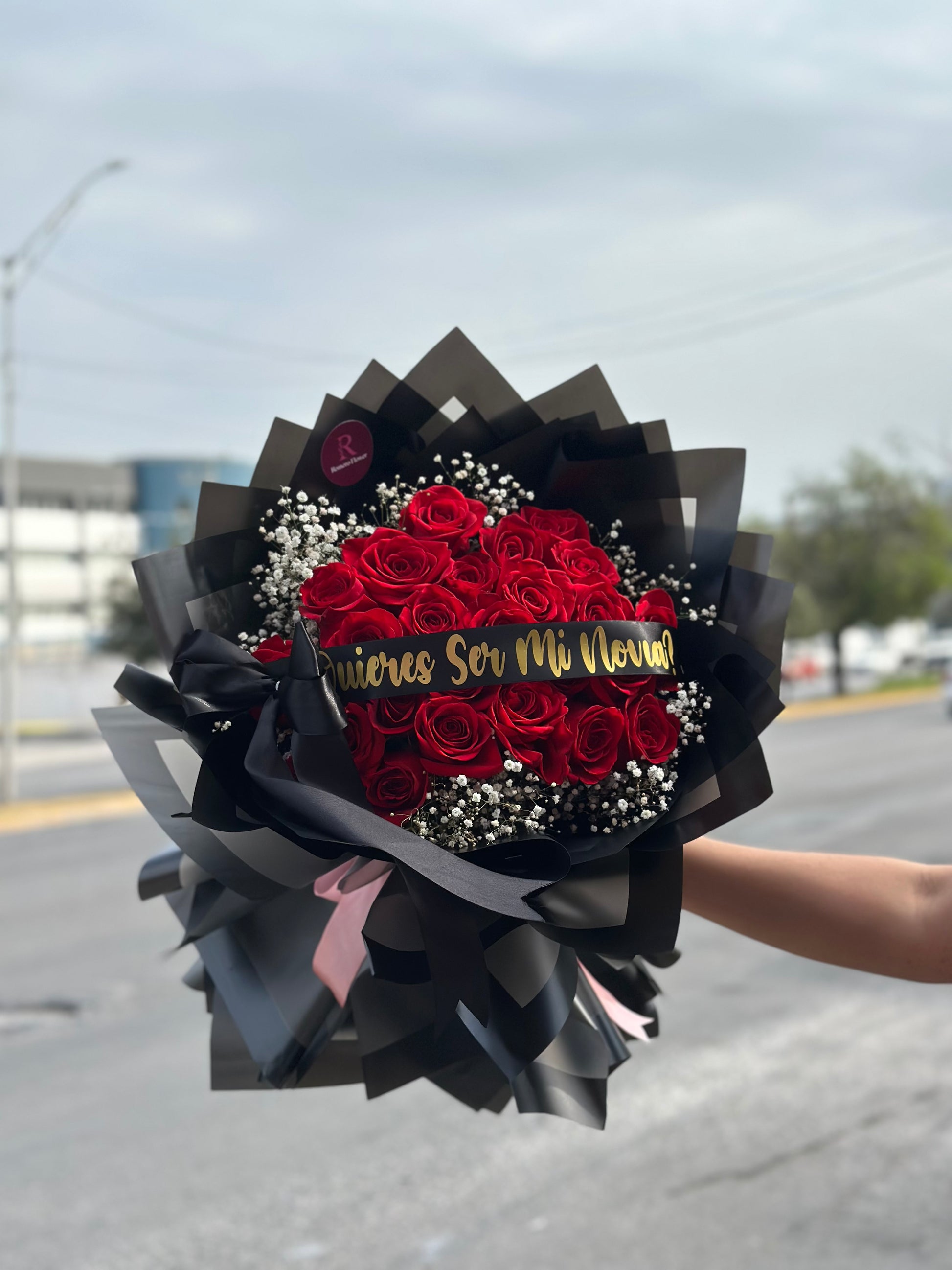 Un ramo diseñado para momentos que cambian la vida: 24 rosas rojas con listón especial y papel premium negro que realzan su elegancia.