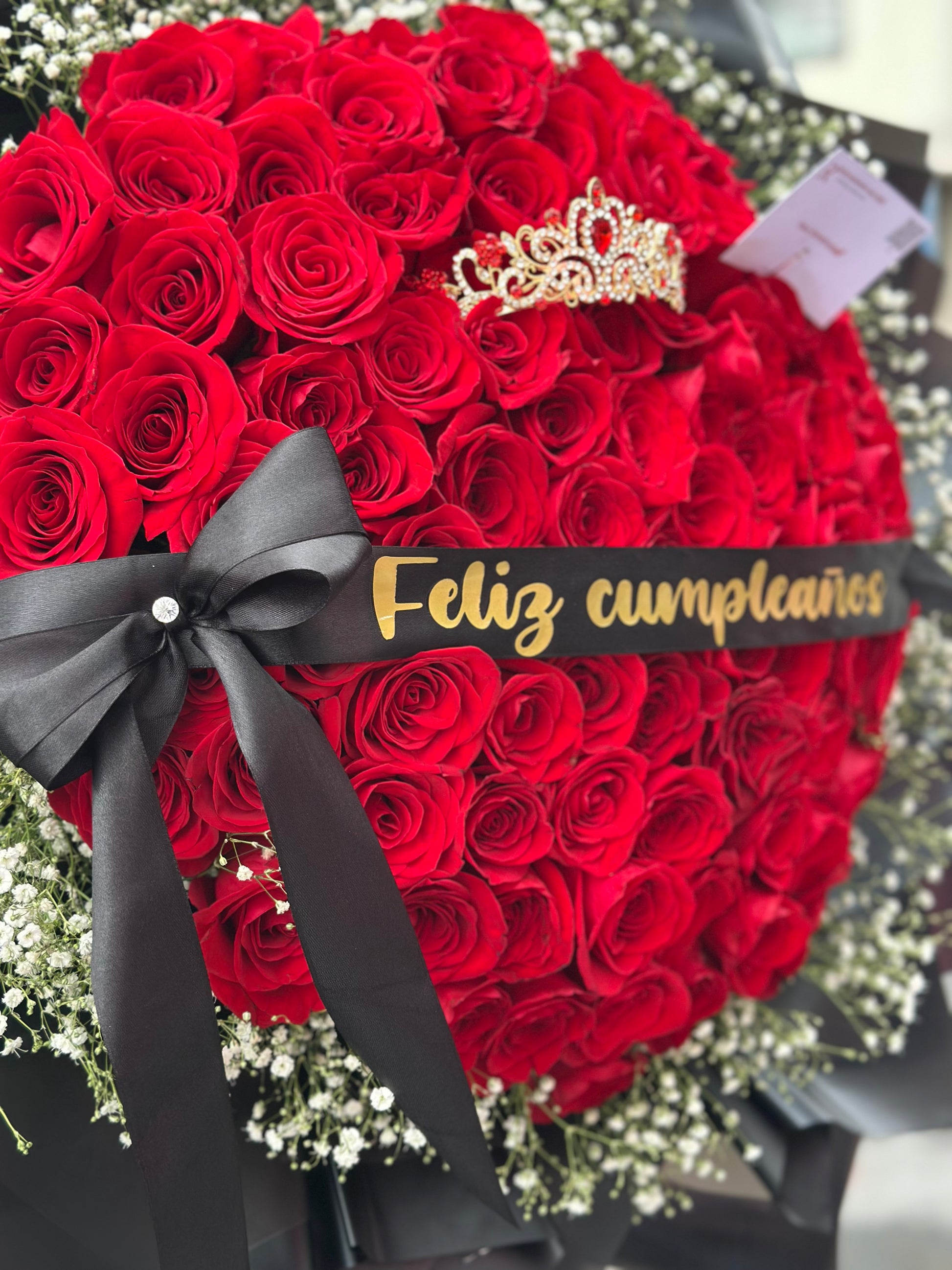 Un ramo imponente con 100 rosas rojas premium, decorado con corona, listón de Feliz Cumpleaños y papel coreano de lujo.