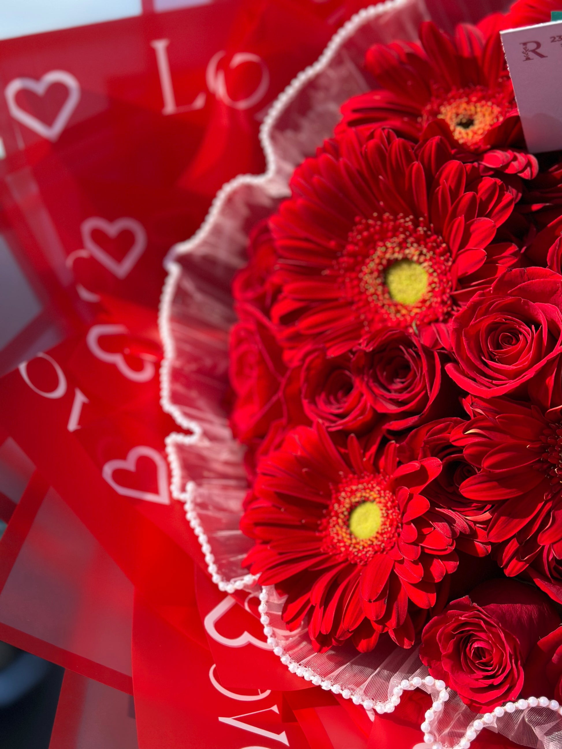 Rosas y gerberas cuidadosamente combinadas en un arreglo sofisticado, moderno y de lujo.