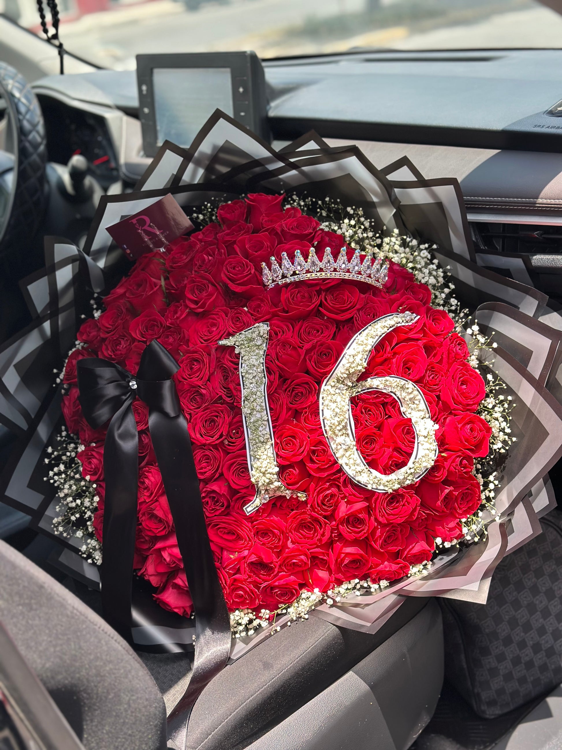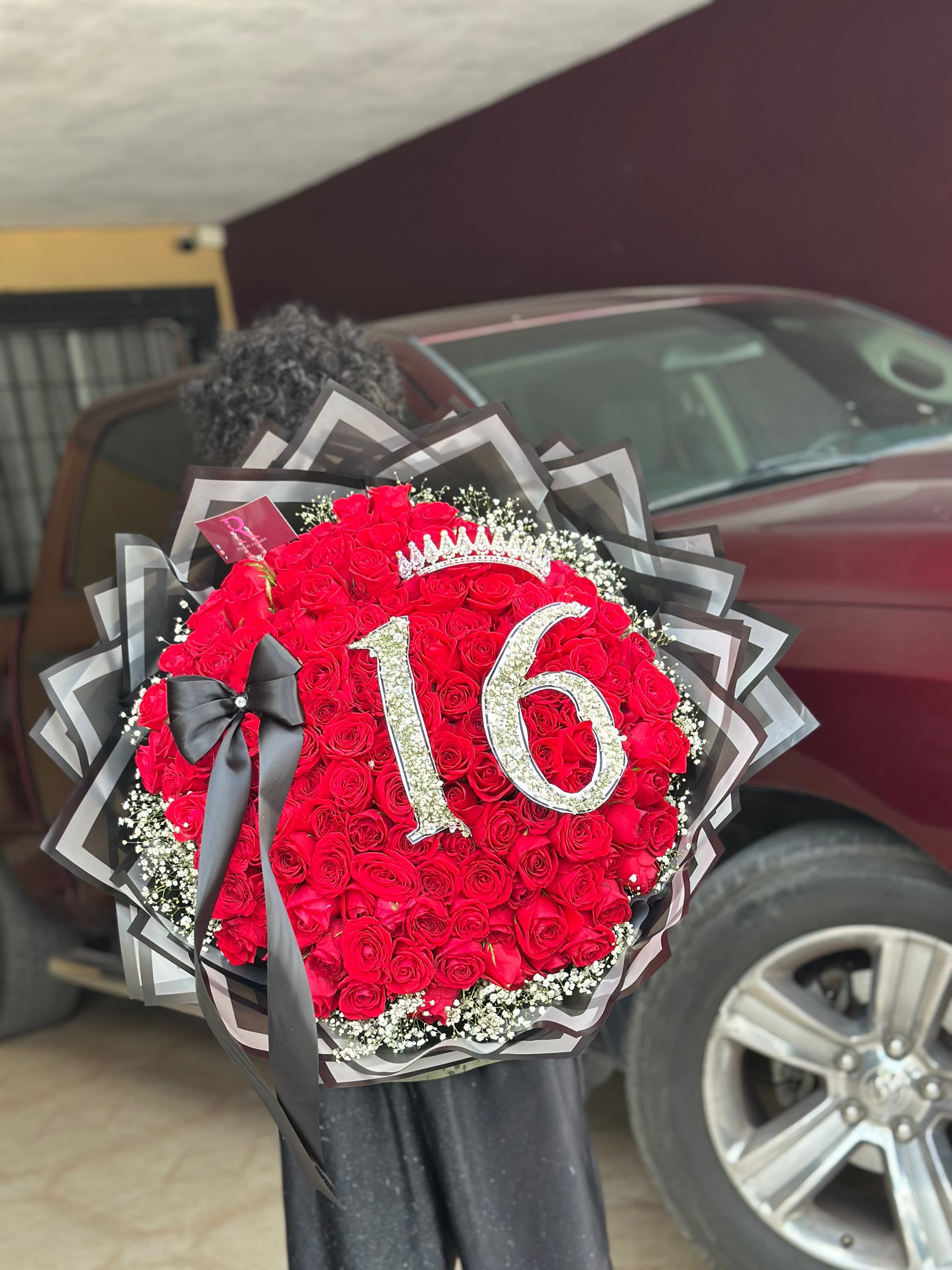 Imponente corazón de rosas rojas con número personalizado y detalles de lujo. Ideal para sorprender y dejar huella.