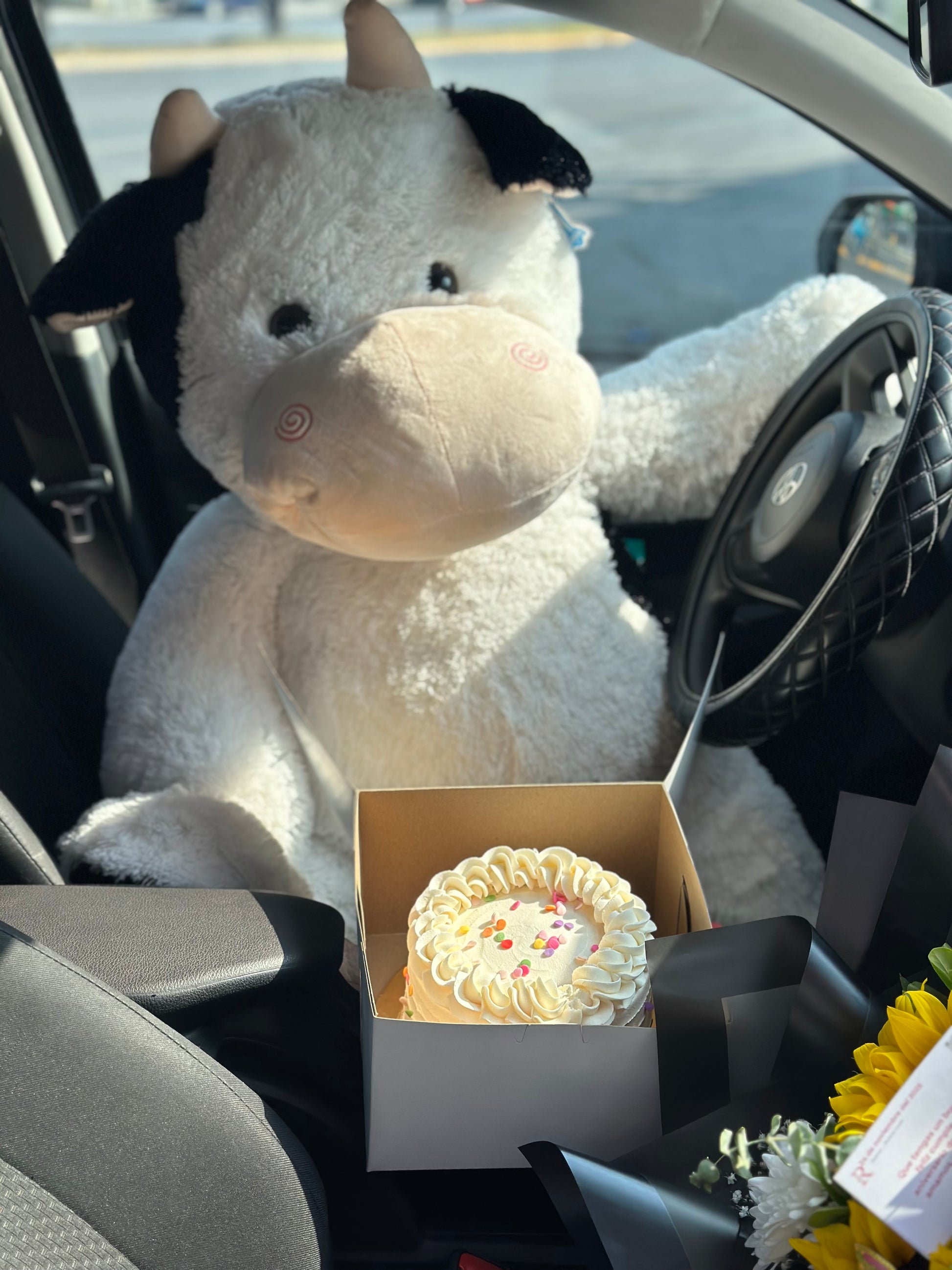 Incluye un ramo buchón de girasoles , un pastel de cumpleaños Sweet Pink y un peluche de vaquita súper tierno.
