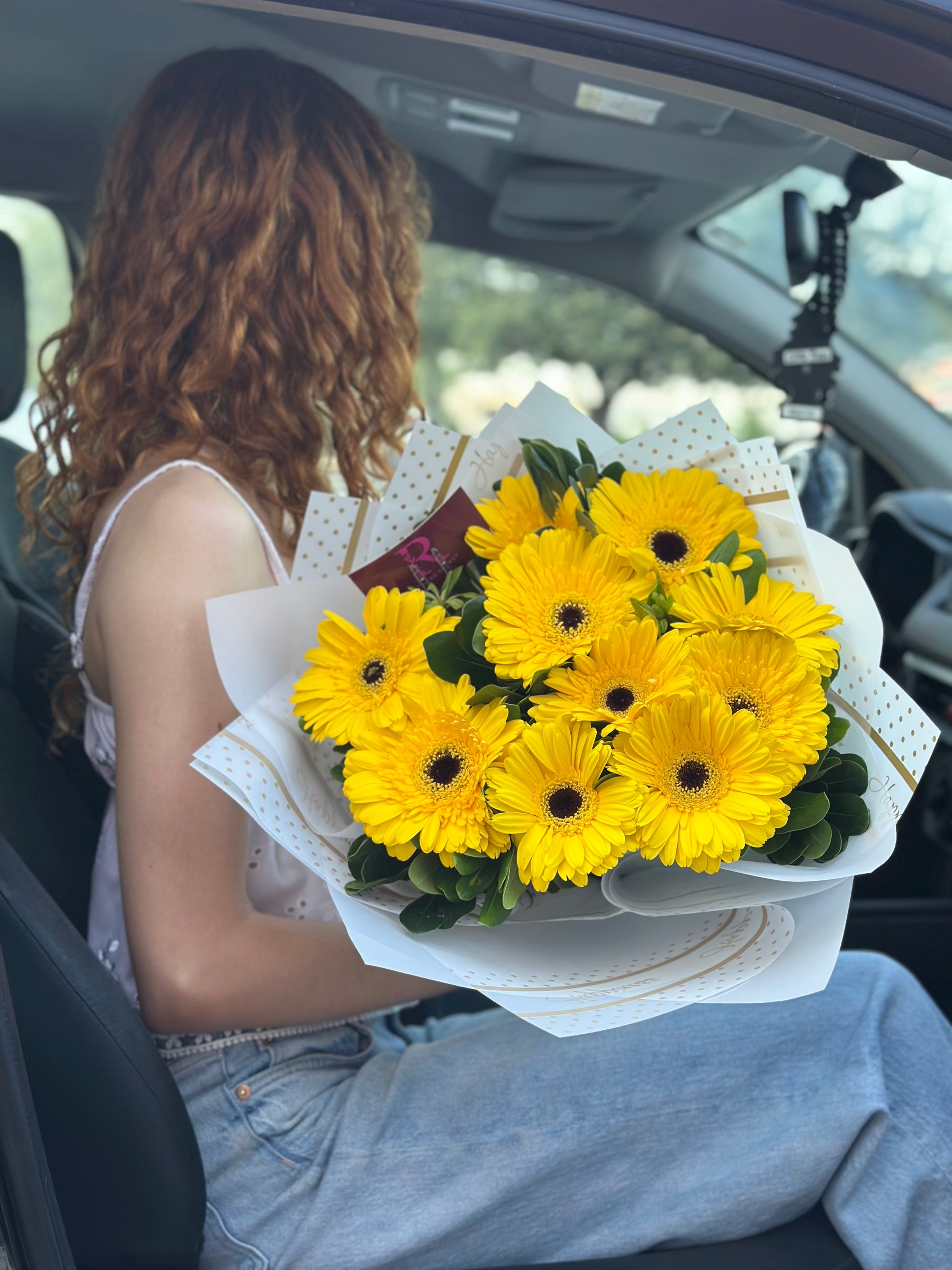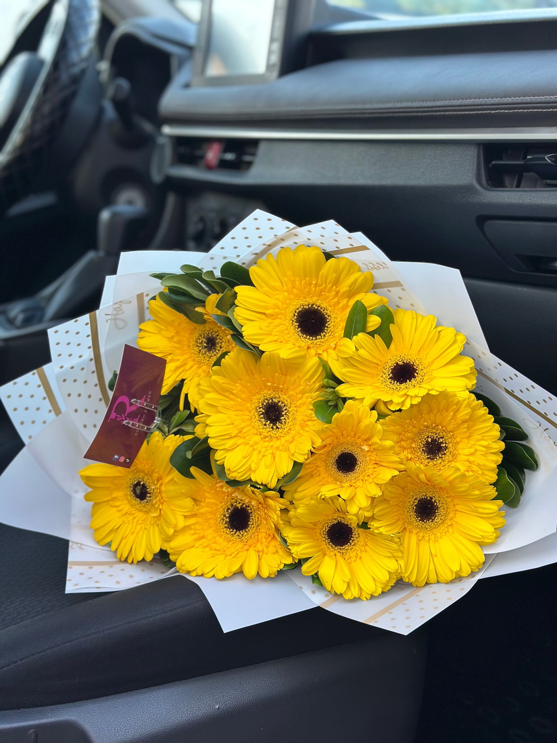 💛 Diez gerberas amarillas que transmiten energía, alegría y amor puro. Envueltas en papel coreano premium y con dedicatoria personalizada.