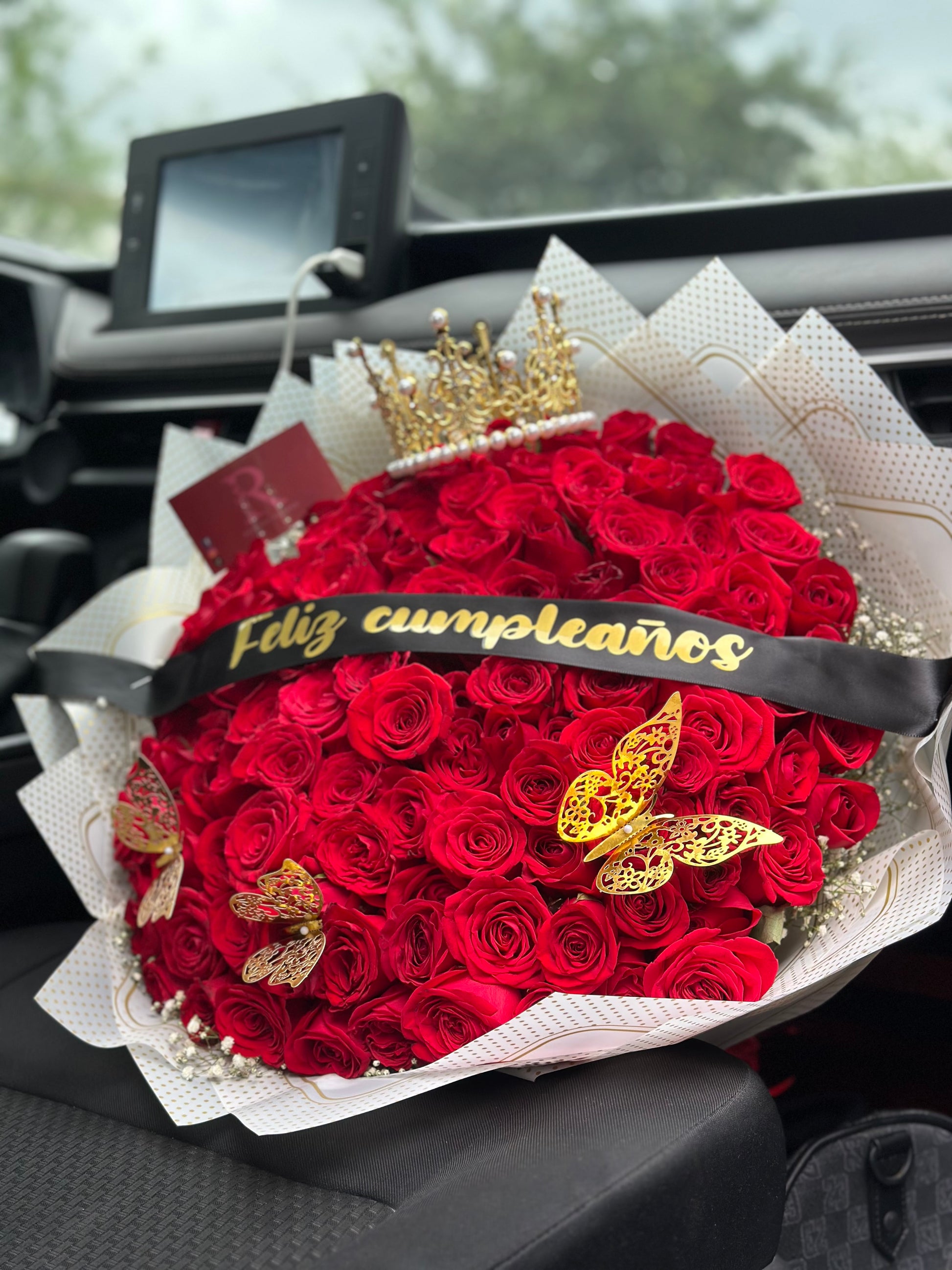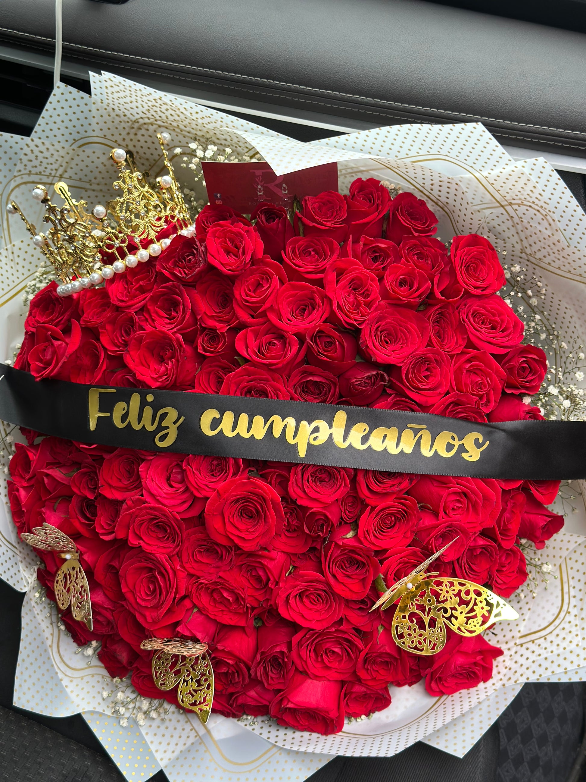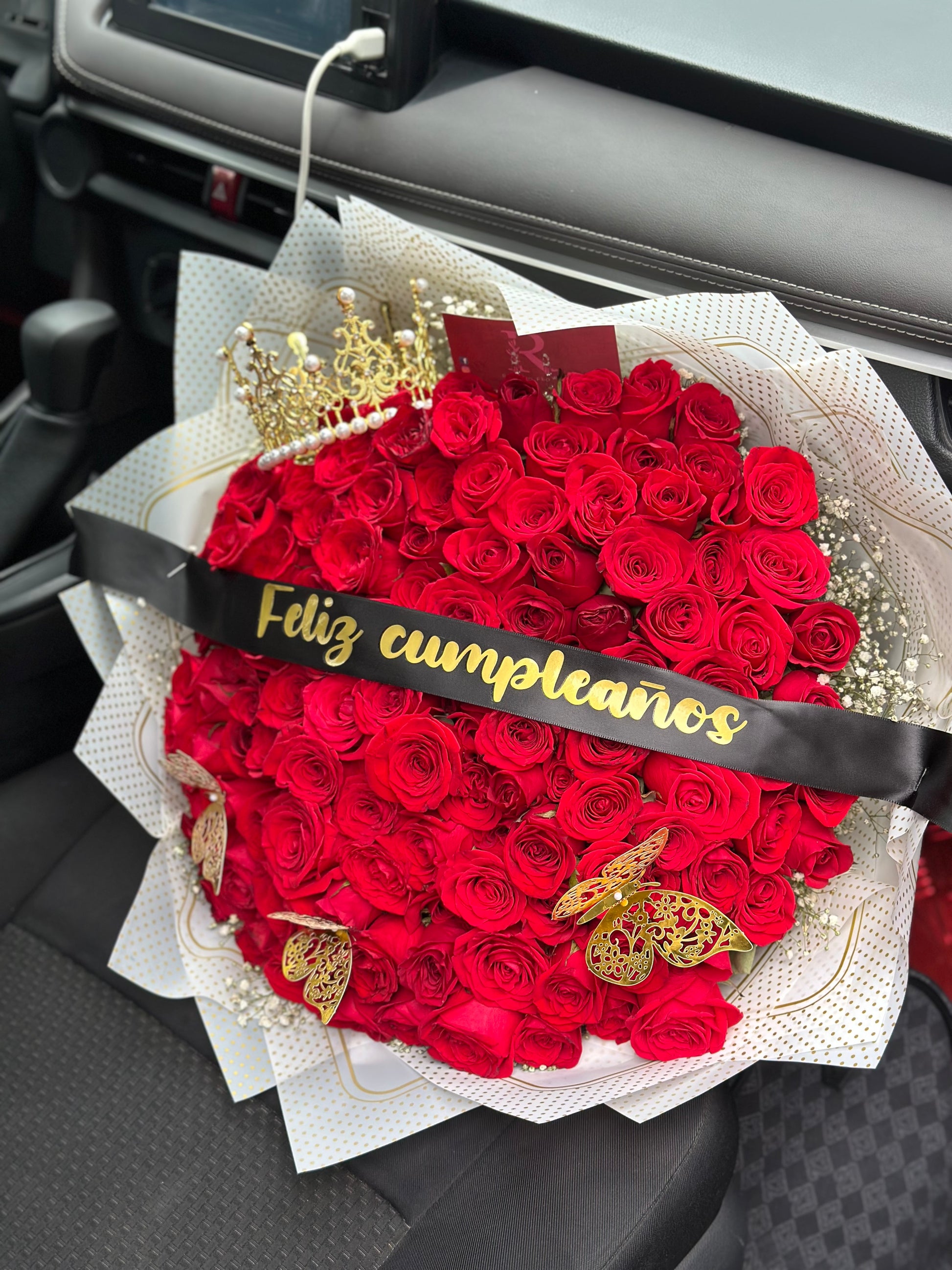 "Este magnífico ramo de 100 rosas rojas 🌹 es la máxima declaración de amor y elegancia. Perfecto para ocasiones inolvidables como propuestas, aniversarios o para sorprender como nunca antes. Cada rosa refleja pasión y devoción, creando un regalo que habla desde el corazón. ❤️"