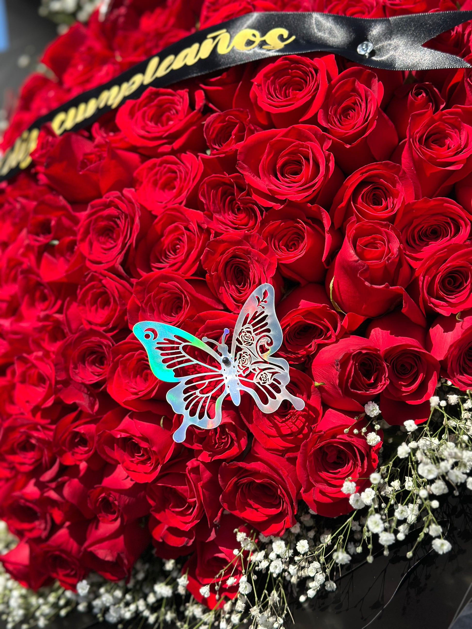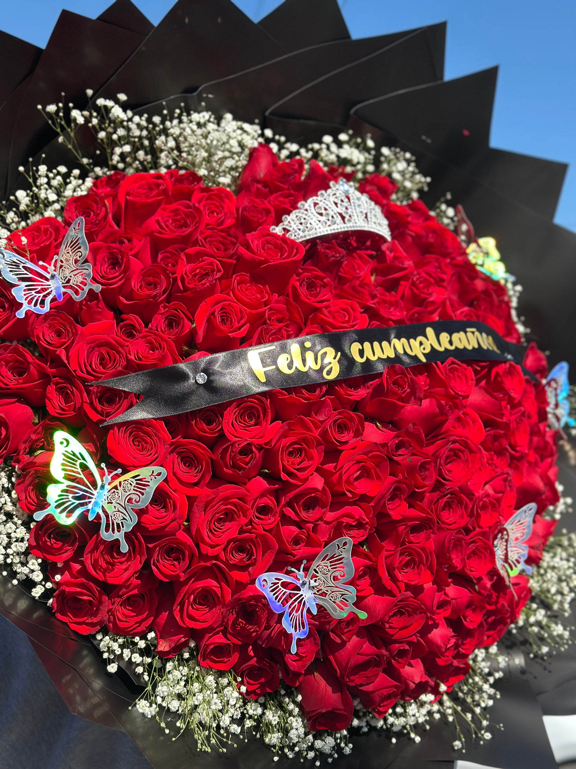 Un arreglo imponente y de alto impacto , elaborado con 200 rosas rojas premium cuidadosamente acomodadas para lograr una presencia espectacular. Incluye listón de Feliz Cumpleaños , corona de lujo , mariposas decorativas y papel premium , creando un diseño elegante que roba miradas desde el primer momento.