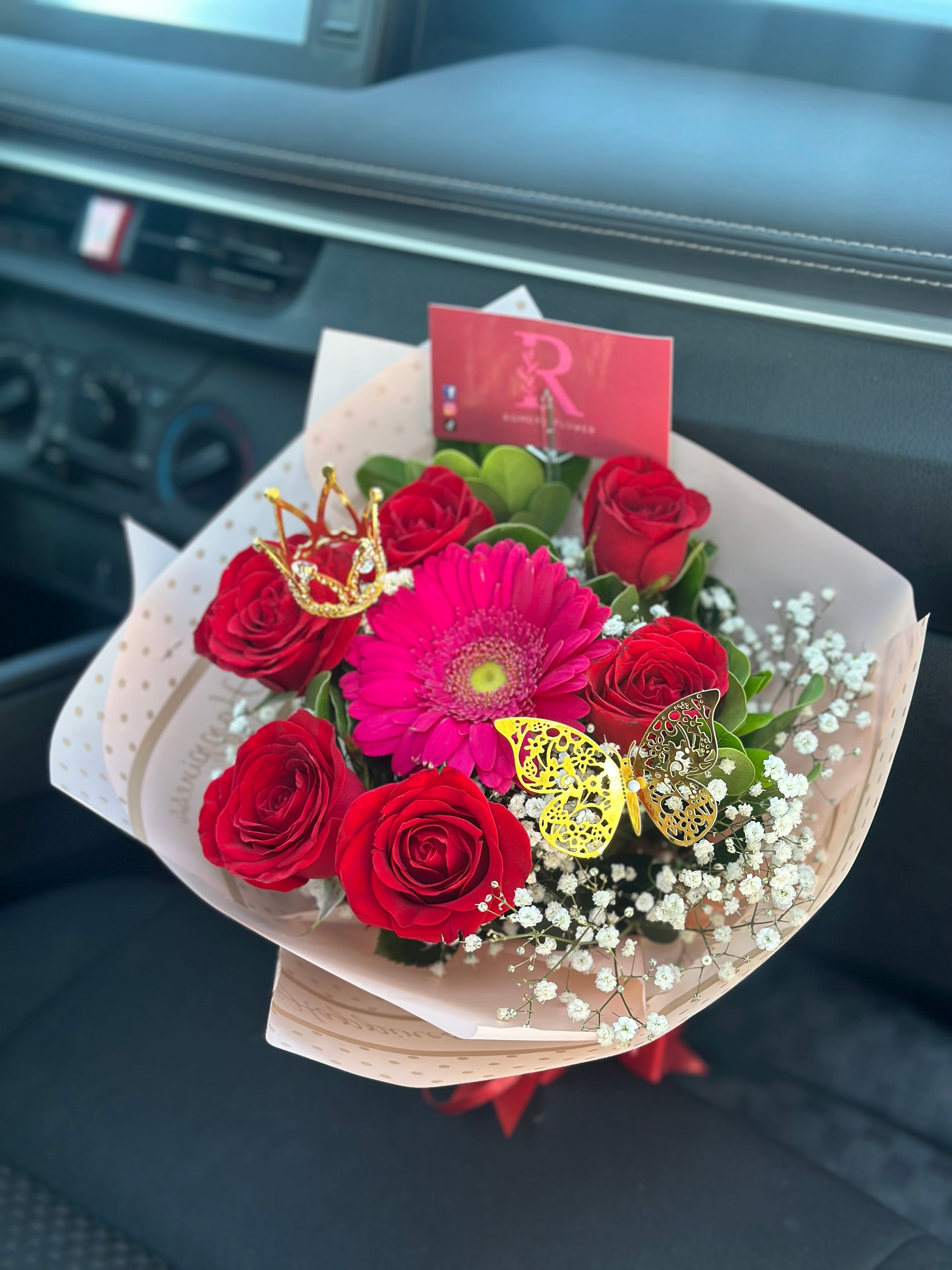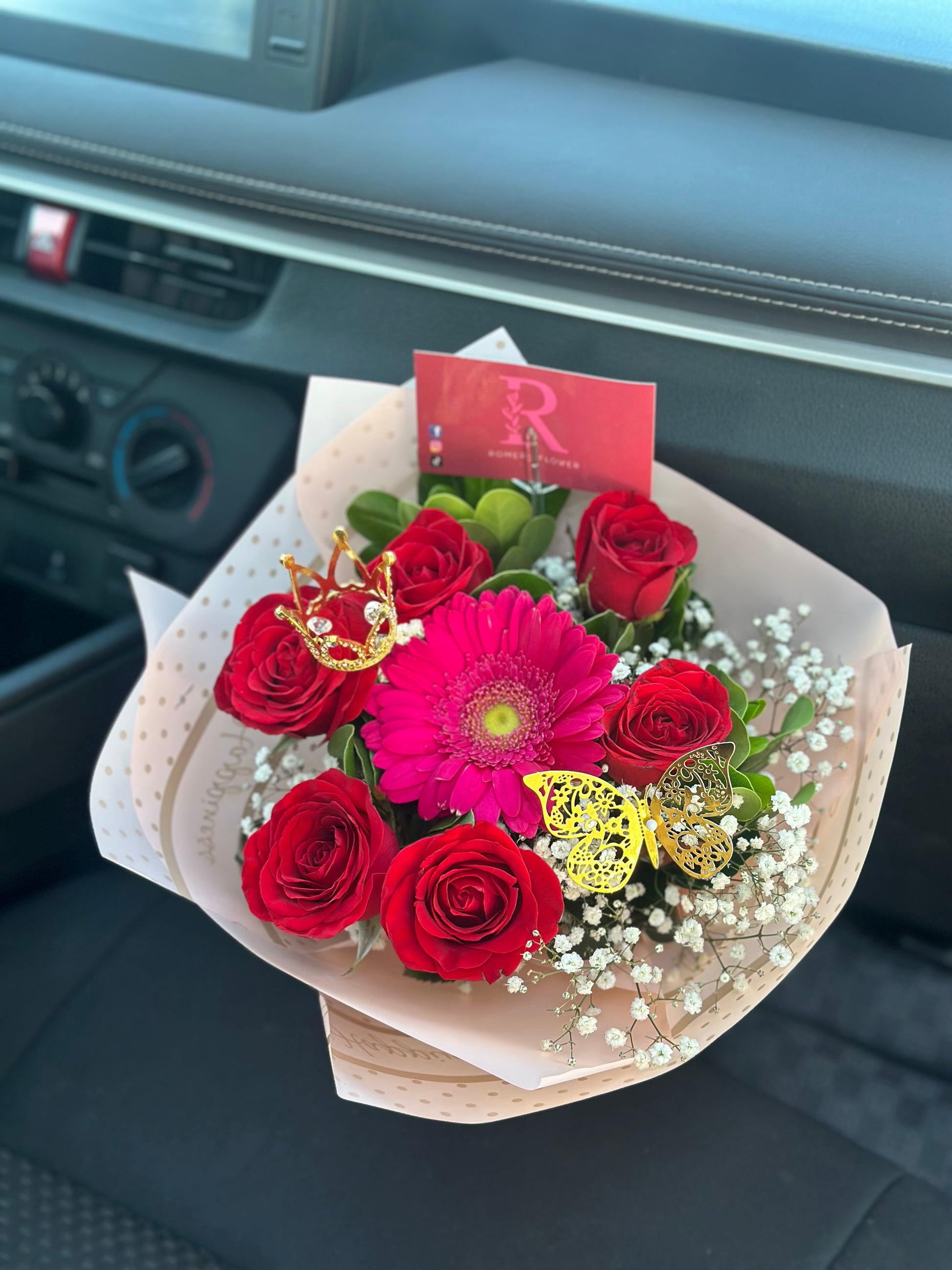 Un ramo sencillo y elegante con 6 rosas rojas, 1 gerbera y detalles premium. Ideal para sorprender sin gastar de más. ✨